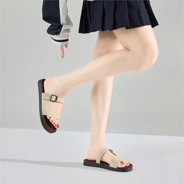 Dép thiết kế hai quai ngang cách điệu kết hợp xỏ ngón, ôm vừa vặn chân, một quai vắt chéo ôm từ mu xuống ngón cái, tạo điểm nhấn nữ tính. Phần mũi bo tròn, form dáng vừa vặn, êm ái.